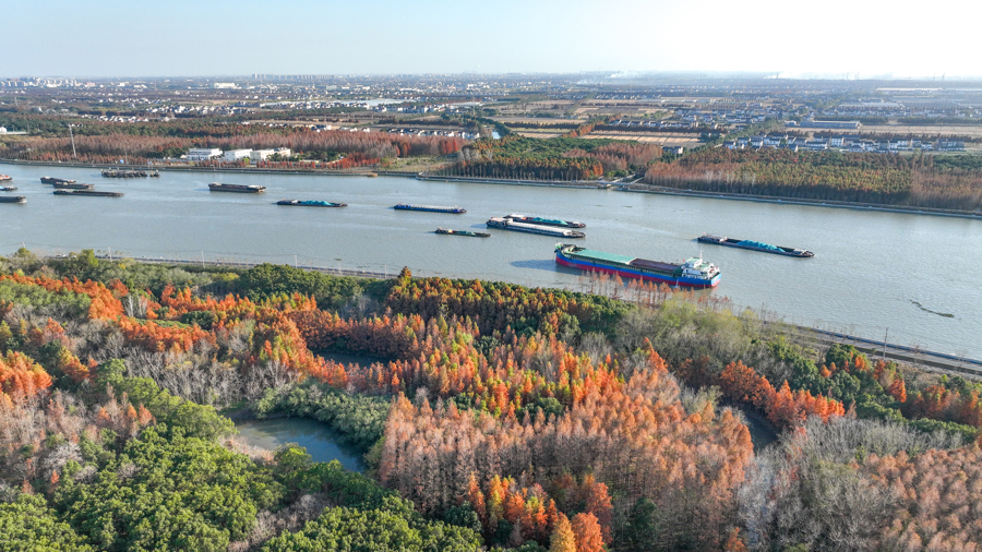 12月9日,松江区米市渡松南郊野公园迎来了水杉林的最佳观赏期。成片水杉已褪去翠绿,换上五彩斑斓的"冬装",从金黄到橙红再到深赭,层层递进的色彩交织成一幅绚丽油画,吸引众多市民游客前来沉浸式体验这短暂的自然盛宴。